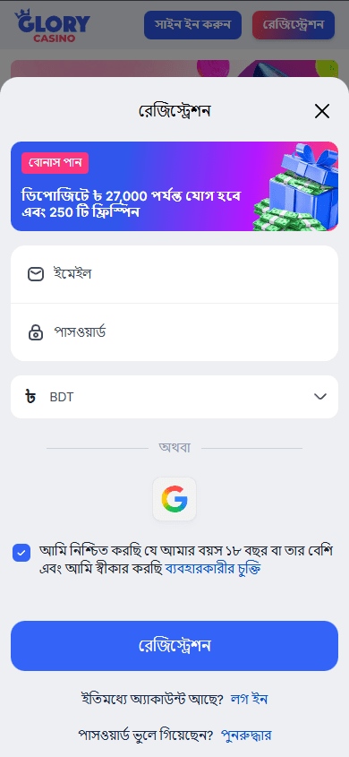 • Receive your Glory Casino welcome bonus. Make your first deposit within 60 minutes of registration. You will receive a 125% bonus. If you deposit later, the bonus will be 100%. To receive an additional 250 free spins, your deposit must be 1,500 BDT or more.